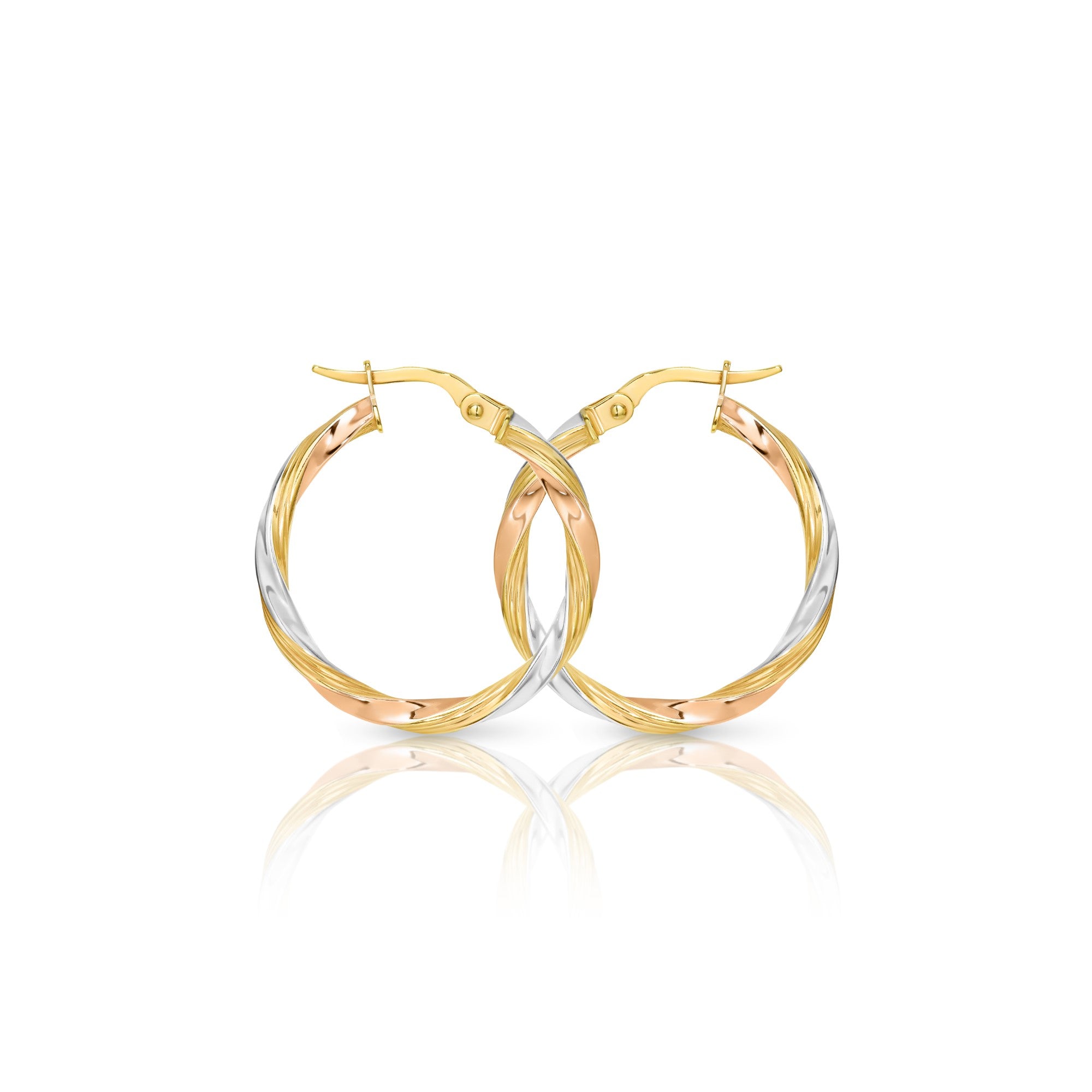 9ct Three-Tone 15mm Polished/Ridged Ribbon Twist Hoop Earrings