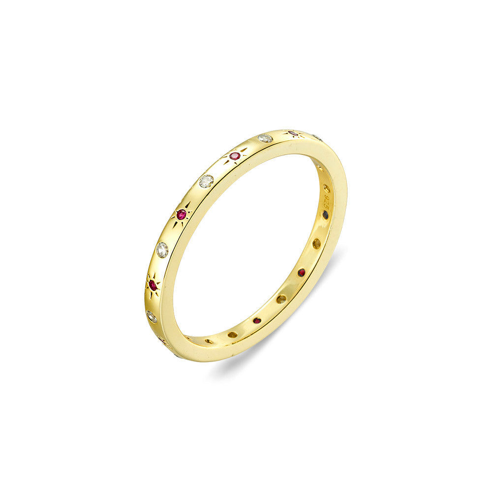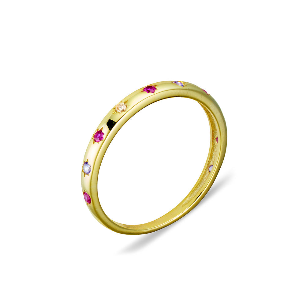 14ct Gold Plated Sterling Silver 14k Gold Plated Ruby Pink Northern Star & White Cubic Zirconia Fine Band Ring